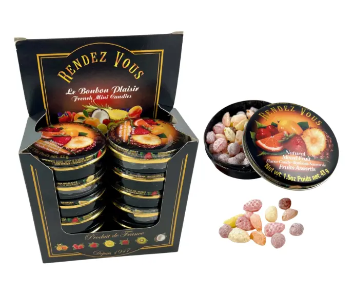 Rendez Vous all-natural candies are imported from France, are available in seven flavors, and packaged in a convenient round tin.